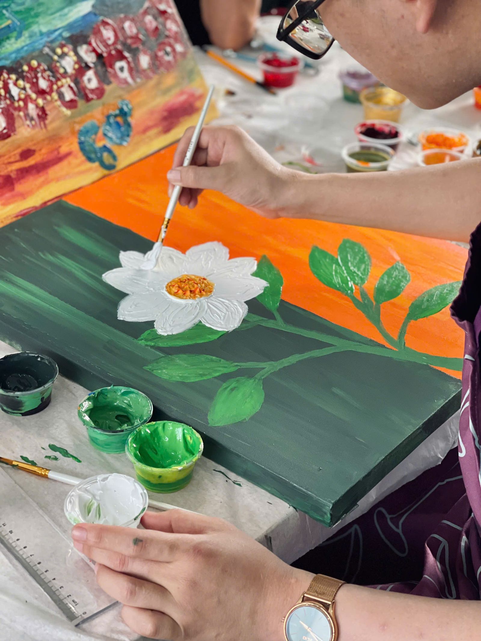 “Khác với những workshop mình từng tham dự, người tham dự thường vẽ theo mẫu có sẵn. Workshop ở Đông Gia cho phép mình tự do thể hiện, trải nghiệm sự kết hợp thú vị của màu và vật liệu để tạo ra những hoạ tiết, hình ảnh thú vị.” - Bạn Ngọc Minh chia sẻ.